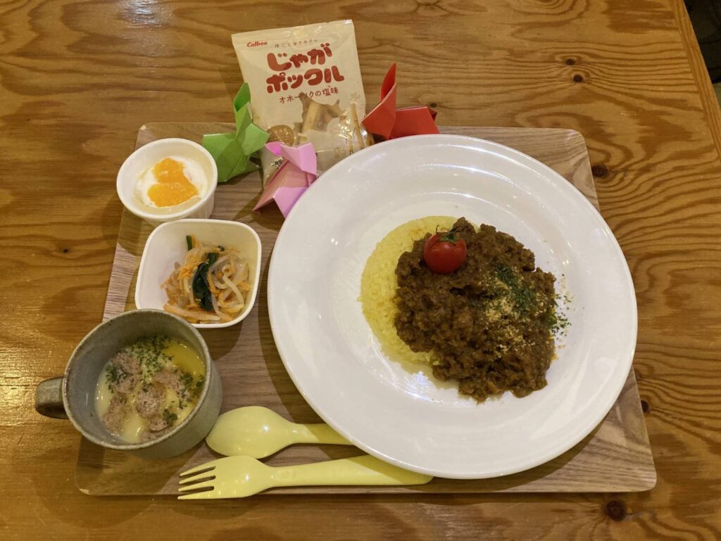 メニュー/ターメリックライスのキーマカレー、パンプキン&コーンポタージュスープ、もやし&ニンジンナムル、フロマージュ
