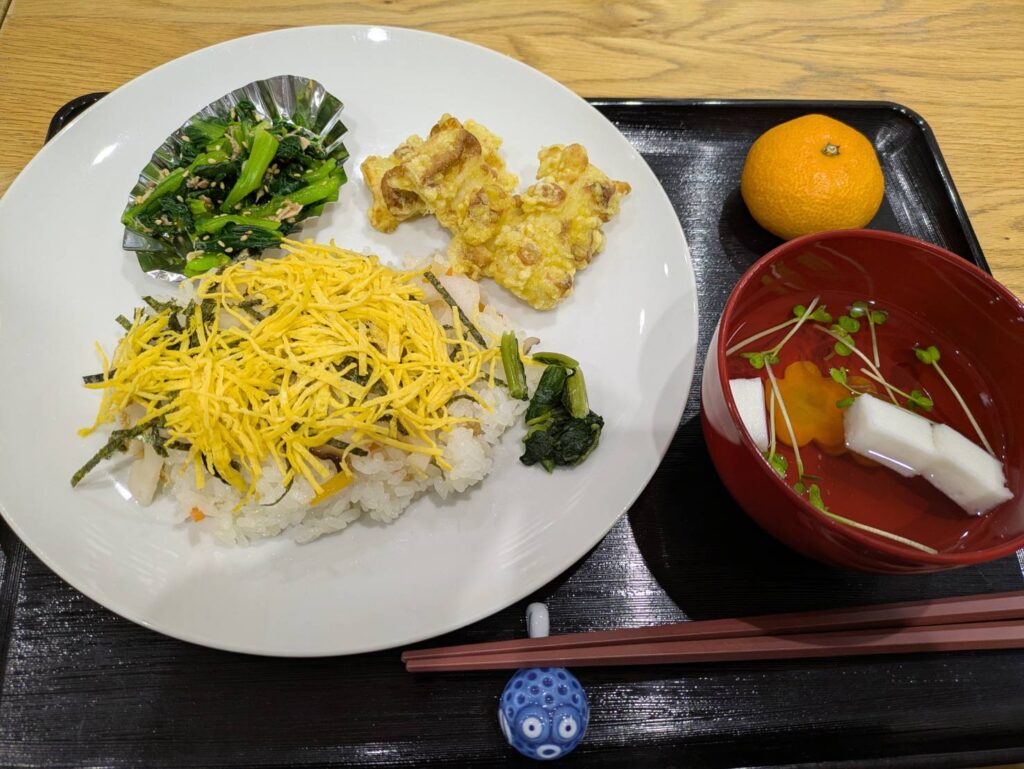 メニュー/五目寿司、小松菜の和え物、ちくわのカレー揚げ、すまし汁、みかん